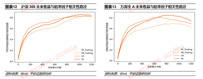 周期性检验:通过统计赔率因子穿越均值上下一倍标准差的时间,测算赔率因子均值回复的周期。周期长短决定了赔率交易的频率和等待盈利周期长短,均值回复周期短的赔率因子具有显著优势。使用赔率因子3年均值及标准差绘制布林带,赔率因子穿越上下布林带的周期长度反映了其均值回复速度,也代表了赔率交易的频率和等待盈利周期长短。当判断赔率处于历史相对高位或低位时,大致预估在四分之一周期后回复到对称位置。PEG指标波动较大周期不稳定,不参与测算。上证50历史PB、股息率DY均值回复速度显著优于历史PE;沪深300、万得全A各赔率因子均值回复速度相当,周期在950天左右;横向来看,上证50、沪深300、中证800、万得全A、创业板指的股息率DY的均值回复周期较为合理,中证500市销率PS周期合理,中证1000股息率DY周期较长,应该选择相关性其次的PB指标。