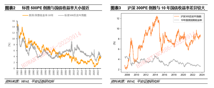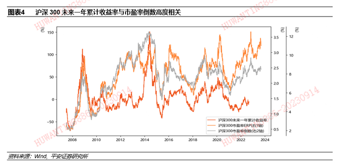 我们在实证中用绝对估值指标除以10年国债收益率作为股债轮动信号的ERP,可以消除不同指标绝对值差异过大的问题。在Fed模型提出时,美国预期市盈率的倒数与10年债券收益率的大小维持在接近的范围上,因此计算ERP时做差是合理的。当我们使用历史市盈率并将时间窗口扩大到更长的时间范围上时,做差得到得ERP指标与股债相对收益的相关性逐渐减弱。在A股市场,历史市盈率倒数与国债收益率的大小差异较大,做差得到的结果实际上减弱了国债收益率变化带来的影响,使用除数可以减弱绝对值大小不一致带来的问题。
