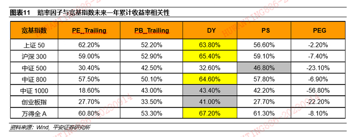 相关性检验:大盘指数赔率因子与未来一年累计收益率的相关性显著强于小盘因子,更适合作为赔率交易标的。上证50、沪深300、中证800、万得全A的股息率DY与收益相关性较高,更适合作为赔率因子,中证500、中证1000、创业板指不适合作为赔率交易标的,各宽基指数未来收益与PEG相关性差。测算各指数未来一年累计收益率(252个交易日)与赔率因子的相关性,大盘指数的相关性显著大于小盘指。具体来说,上证50、沪深300、中证800、万得全A的历史PE、DY与未来一年收益均有不错相关性,其中DY相对更高。中证500、中证1000、创业板指与未来收益相关性较弱。相关性强的指数与因子对于未来收益走势更有信号价值,即相关性分析提示股息率因子DY在上证50、沪深300、中证800、万得全A具有择时价值。