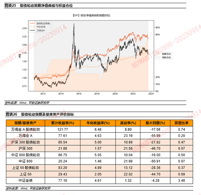 股债轮动的择时策略基于长短滚动窗口的相对分位数确认买入或卖出信号,采用了一种基于市场情况和赔率指标的动态资产配置方法。赔率因子数据区间为2007年7月至2023年8月,策略信号基于近3年赔率因子生成,因此我们将策略开始时间设定为2011年1月1日,采用日频数据生成策略信号。策略步骤如下:1)策略使用滚动窗口的方式计算了市场赔率指标的分位数,以衡量市场的投资价值,策略初始股票权重为25%,剩余资金配置债券。策略将综合应用于大周期(3年)和小周期(1年)。在大周期内,当市场赔率指标高于特定阈值(上90分位数)时,策略会逐步增加股票权重(日度高位信号增加0.1%仓位),以反映较高的投资机会。相反,当市场赔率指标低于另一个阈值(下10分位数)时,策略会逐步增加债券权重,以减少风险。2)类似地,在小周期内,也会进行类似的调整,但调仓幅度较小(日度高位信号增加0.05%仓位),以应对更短期内的市场波动。3)在生成信号时,同时检查信号的变动是否超过一定阈值。如果变动较大,则更新信号的大小,以避免频繁的交易。我们希望在赔率较高时尽量多买入,在赔率低时谨慎抛售,因此买卖信号的变动阈值略有差异(买入时机为仓位变动5%,卖出时机为仓位变动10%)。4)将信号序列向前移动一个日期窗口的长度,以确保信号与实际建仓操作之间的正确对应关系。