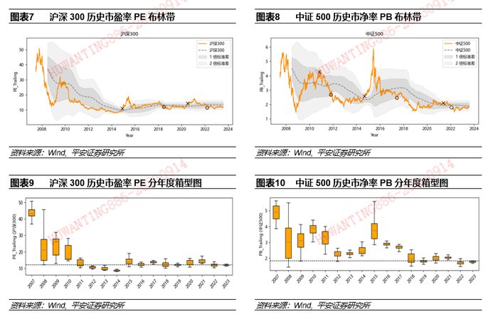 统计特征:赔率因子普遍在2008年前后存在较大幅度的震荡,在2010年以后维持在相对平稳的水平上下波动,并表现出相对稳定的回复周期。以沪深300指数的历史市盈率为例,使用滚动3年的移动均值和方差绘制布林带,赔率因子在接近2倍标准差后通常迎来反转,呈现出显著的均值回复特征。分年度统计的箱型图显示,沪深300的历史市盈率因子在2010年后箱体收窄,在12倍PE水平附近趋于平稳,截至2023年8月31日收于11.65。中证500的历史市净率在2015年前后突破上2倍标准差,迅速发生回落,截至2023年8月31日收于1.72,处于历史相对低位,当前中证500赔率较高。