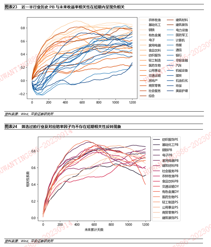 行业上赔率因子与未来累计收益的相关性随着累计天数的增加而增加,与在股指上的表现类似。传媒、电力设备、计算机、通信、环保、煤炭、机械设备、非银金融、美容护理、银行等行业的相关性表现在短期出现显著反转,需要关注行业资产继续上涨/下跌风险。受到短期动量的效应,一个过高估值(低估值)的市场可能会变得更加过高估值(低估值),此时随着累计天数的增加,赔率因子与未来收益率相关性呈现U型。传媒、电力设备、计算机、通信、环保、煤炭、机械设备、非银金融、美容护理、银行等行业的相关性路径呈现显著U型特征,需要警惕相关行业短期内的超涨/超跌风险。我们筛选的行业及对应赔率因子均不存在短期相关性反转现象,更加适合赔率交易。