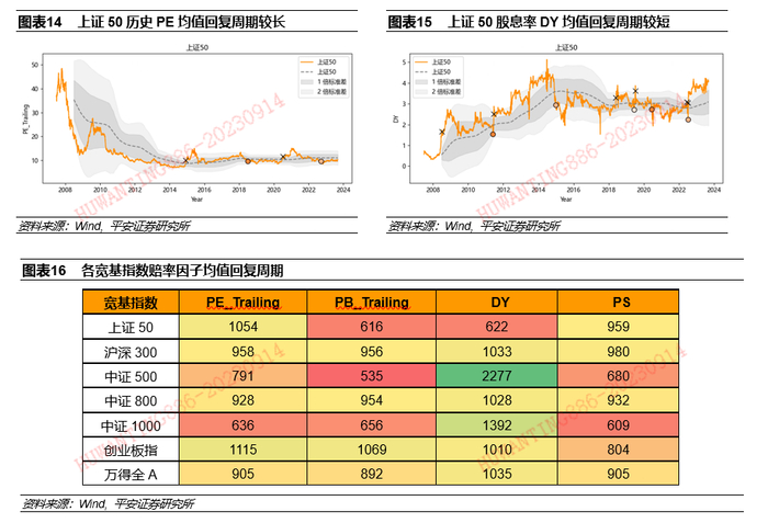 统计特征:中证1000、创业板指和中证50估值水平较高,股息率DY在指数间整体水平较为分散。从历史市盈率PE来看,中证1000、创业板指和中证500这几个偏小盘指数PE整体中枢较高,指数内PE存在显著差异。而沪深300、中证800、万得全A、上证50的PE整体水平较低,指数内差异较小;从股息率DY来看,指数间DY相较于PE更加分散,上证50、沪深300DY较高,各指数内DY差异较大;从市销率PS来看,同样是偏小盘指数估值较高,创业板内PS差异较大。
