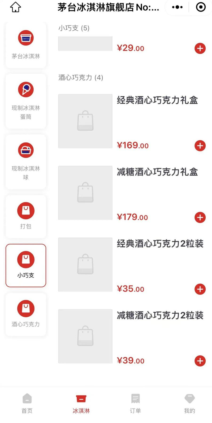 在茅台冰激凌小程序上,部分店门已能看到酒心巧克力相关的产品信息。其中,经典酒心巧克力礼盒2颗装定价35元/盒、6颗装定价99元/盒、12颗装定价169元/盒;减糖酒心巧克力礼盒2颗装定价39元/盒、6颗装定价109元/盒、12颗装定价179元/盒。