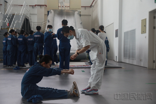 南航产教融合实训基地乘务培训中心安训教员李星向记者介绍:“针对紧急撤离,乘务员会做以下训练但不限于:紧急开关舱门训练、撤离滑梯训练、真实灭火/场景灭火训练、陆地撤离程序、水上撤离程序、快速离机处置、中断起飞处置,中断滑行处置、冲出跑道处置、水上求生等等。”