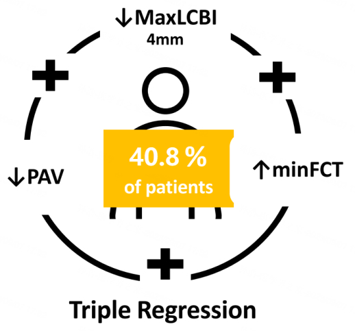在此研究中,Flavio Giuseppe Biccire教授重点提出了一个概念:“三重逆转(triple regression)”,定义为动脉粥样硬化体积百分比(PAV)减少、4mm内最大脂质核心负荷指数(maxLCBI4mm)减少、最小纤维帽厚度(FCT)增加,并对发生三重逆转患者比例以及独立预测因素进行了分析。