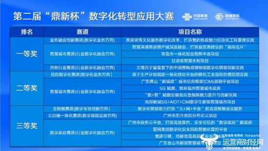 本届“鼎新杯”大赛面向六大方向分别设置数字政 府、智慧城市、业务融合等多个专题赛道。联通数科在行业数字化和数字化业务领域突出重围,申报的推进宣传文化服务数字化改革、智慧洋浦推进港产城深度融合、青岛市一体化综合指挥平台、甘肃省智慧水利项目、黄梅戏博物馆数字化转型创新实践六大成果均获得一等奖。