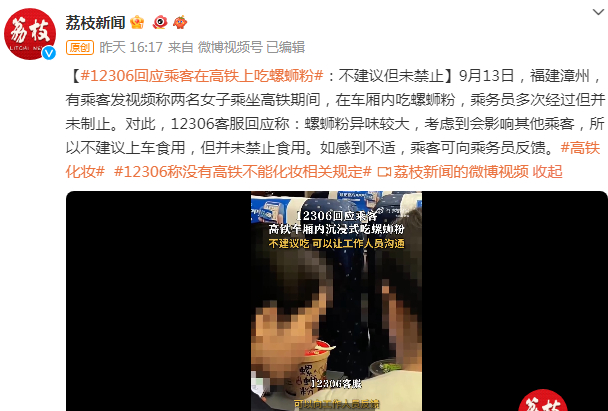 出行高峰临近,部分乘客乘坐火车时的行为近日也引起争议。如9月13日,福建漳州,有乘客发视频称两名女子乘坐高铁期间,在车厢内吃螺蛳粉,乘务员多次经过但并未制止。对此,12306客服回应称:螺蛳粉异味较大,考虑到会影响其他乘客,所以不建议上车食用,但并未禁止食用。如感到不适,乘客可向乘务员反馈。