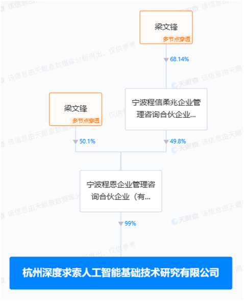 天眼查信息显示,2023年7月17日,一家名为“杭州深度求索人工智能基础技术研究有限公司”(以下简称“深度求索”)的公司成立,其实际控制人即为梁文锋。