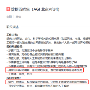 招聘启事显示,幻方量化正在招募“数据百晓生”,要求应聘者“提供人类历史、文化、科学等相关的知识来源(包括网站、书籍、报纸等在内的所有文字媒介和渠道),制定数据收集方案,和数据工程师一起构建完善的世界语言知识库,辅助技术人员一起用世界知识和文字数据扩充AGI模型的能力边界”。