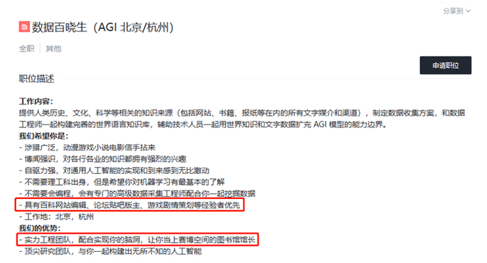 近日,幻方量化发布招聘公告称,公司正在招募“数据百晓生”,希望其辅助技术人员一起用世界知识和文字数据扩充AGI模型的能力边界,具备百科网站编辑、论坛贴吧版主等经验者优先。