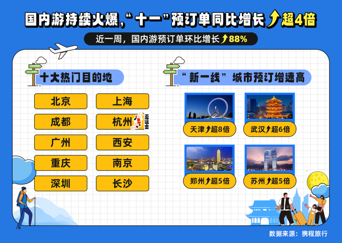 携程同一天发布的《中秋国庆旅游预测报告》则显示,国内旅游产品“十一”预订量环比前一周增长88%,同比去年增长超4倍。其中,北京、上海、成都、杭州、广州、西安、重庆、南京、深圳、长沙是国庆热门旅游目的地前十。此外,天津、武汉、郑州、苏州等“新一线”城市预订量增速也较高,均比去年同期增长5倍以上。其中,天津今年以来频频刷屏,旅游订单同比去年增长8倍。出境游亦迎来井喷式增长,“十一”期间整体订单同比去年增长近20倍。出境游的热门国家包括泰国、韩国、马来西亚、新加坡、澳大利亚、英国等等。