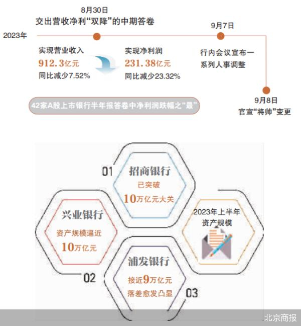 随后几年内,以零售见长的招商银行推进零售战略不断升级,并由“轻型银行”转型至“价值银行”,资产规模迅速扩张,2023年上半年,招商银行已突破10万亿元大关;同期,兴业银行围绕“商行+投行”战略深化拓展,加大绿色贷款投放,资产规模逼近10万亿元,而浦发银行则接近9万亿元,落差愈发凸显。