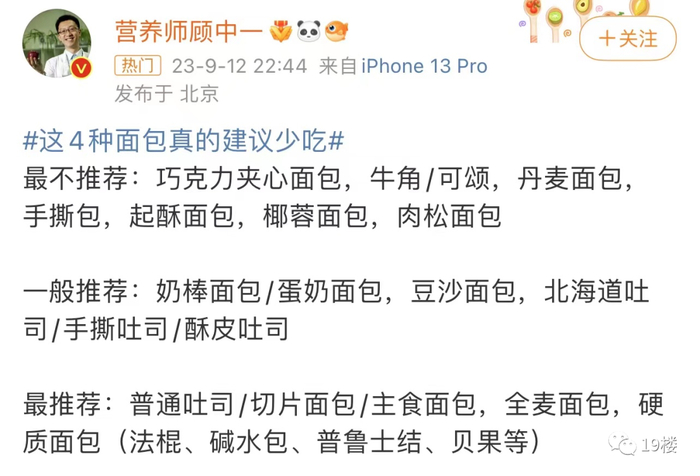 9月12日晚,微博大V、清华大学公共卫生硕士、北京营养师协会理事顾中一发布了一则视频,提醒大家,有4种面包建议少吃,分别是巧克力夹心面包、牛角/可颂/手撕/起酥类面包、椰蓉面包、肉松面包。