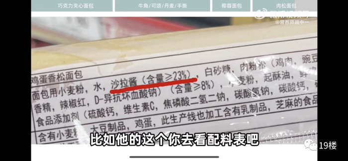 比如某品牌一款肉松面包就标明了沙拉酱含量≥23%,沙拉酱用量是远超肉松粉的。