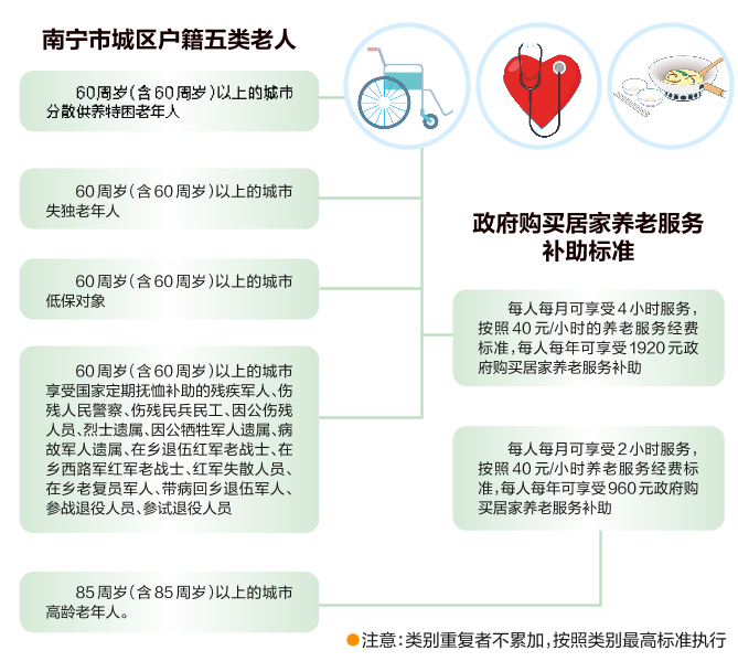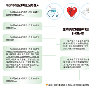 政府购买居家养老服务列入南宁2023年度市本级为民办实事的项目工程之一。该项目主要是政府向有资质且符合条件的第三方服务机构购买居家养老服务方式。此次获准的养老服务企业将为全市城区户籍15000名五类老年人提供生活照料、健康管理、精神慰藉、生活代办等居家上门服务,满足老年人多样化居家养老服务需求。