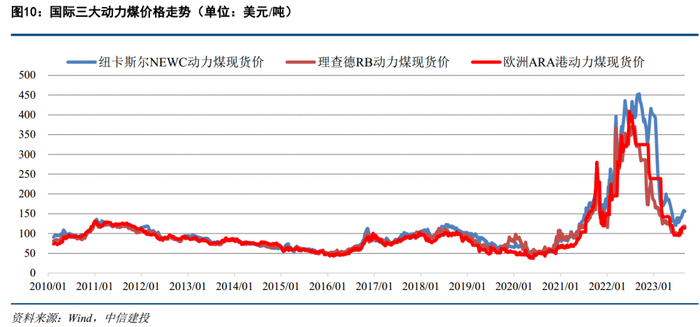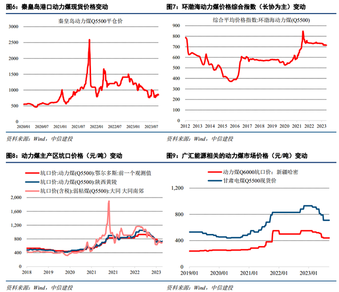 9月8日,秦皇岛动力煤Q5500现货价格为855元/吨,周环比持平。9月6日,环渤海动力煤Q5500综合平均价格指数(长协为主)为715元/吨,周环比持平。9月1日,澳洲纽卡斯尔NEWC动力煤价格为156美元/吨,周环比下跌1.22%;南非理查德RB动力煤价格为119美元/吨,周环比持平;欧洲ARA港动力煤价格为114美元/吨,周环比持平。2023年7月,我国发电量累计值为8450.7亿千瓦时,同比增长4.40%,截至2023年7月,我国火力发电量累计值为35473.7亿千瓦时,累计同比+7.5%。