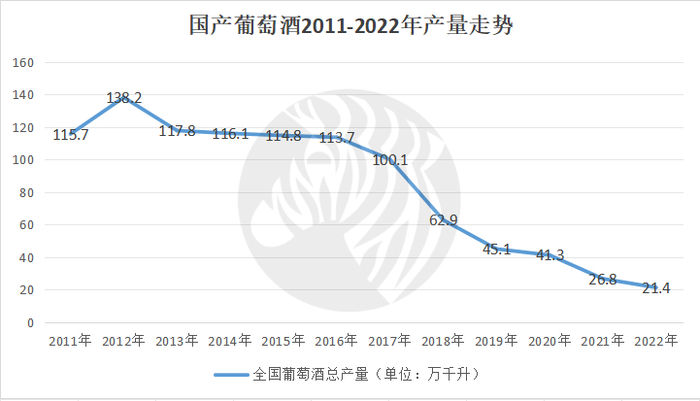 从整个产业来看,自2012年以138.2万吨的产量数据登顶后,国产葡萄酒已连续走了10年的下坡路。这种局面不禁让人发问:国产葡萄酒到底怎么了?