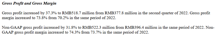 第二季度,高途录得净利润5616万元,和上年同期的净亏损4981万元相比扭亏为盈。期内公司毛利为5.19亿元,同比增加37.3%,毛利率上升至73.8%,上年同期则为70.2%。值得一提的是,这已经是高途连续第三个季度实现正向盈利,2022财年四季度和2023财年一季度,高途分别录得净利润7061万元、1.14亿元。