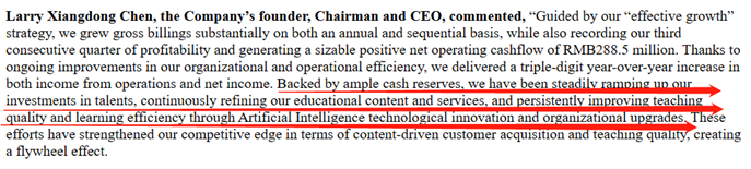 财报中,陈向东称:“连续三季度盈利得益于组织效率与运营效率的稳步提升。”CFO沈楠也表示,通过拓展自营获客渠道,提升课程交付的质量与效率,公司实现了增长与效率的同步提升。