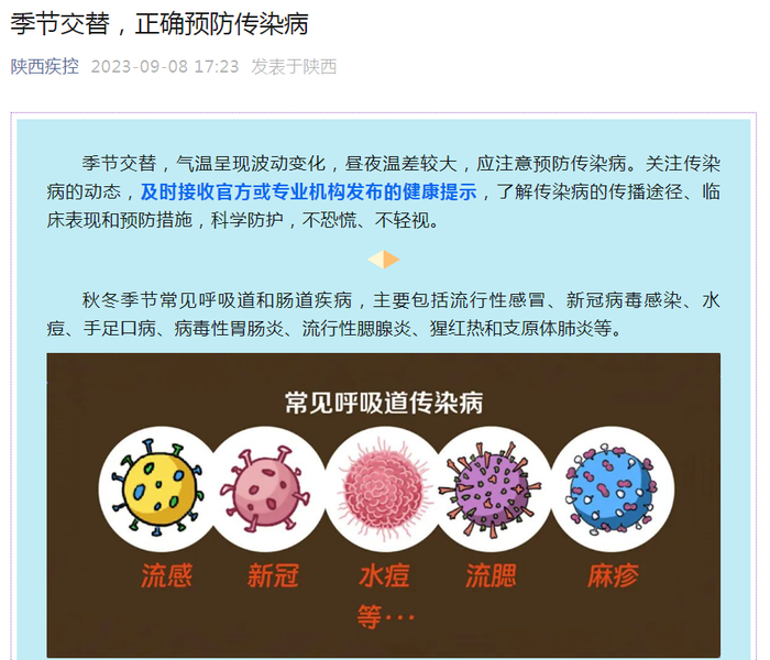 秋冬季节常见呼吸道和肠道疾病,主要包括流行性感冒、新冠病毒感染、水痘、手足口病、病毒性胃肠炎、流行性腮腺炎、猩红热和支原体肺炎等。