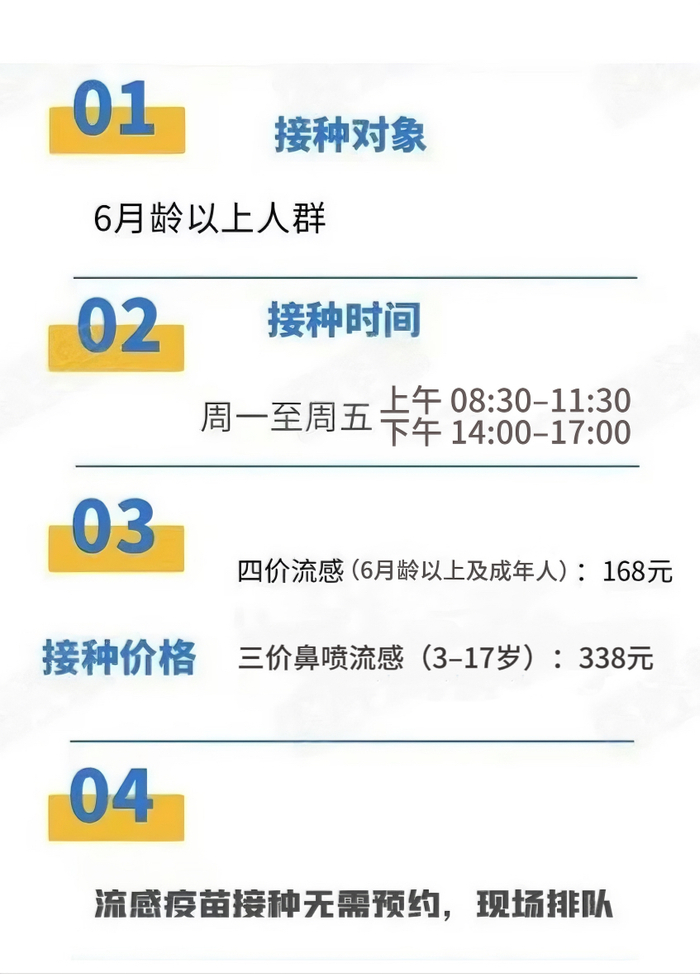 疫苗类型:四价流感疫苗(168元/剂,3岁以上)