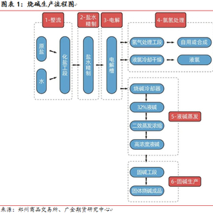 烧碱属于盐化工产业中的重要产品,与纯碱、玻璃、PVC等化工产品一同构成了盐化工领域的关键组成部分。烧碱的生产是氯碱工业的核心环节。在烧碱的产业链上游,主要原材料包括原盐和电力。生产1吨烧碱需要约2300-2400度电,这一消耗在烧碱的生产成本中占到了50%~60%的比重。同时,每吨烧碱的生产需要使用大约1.4-1.6吨原盐,原盐的成本占到烧碱生产成本的约20%。