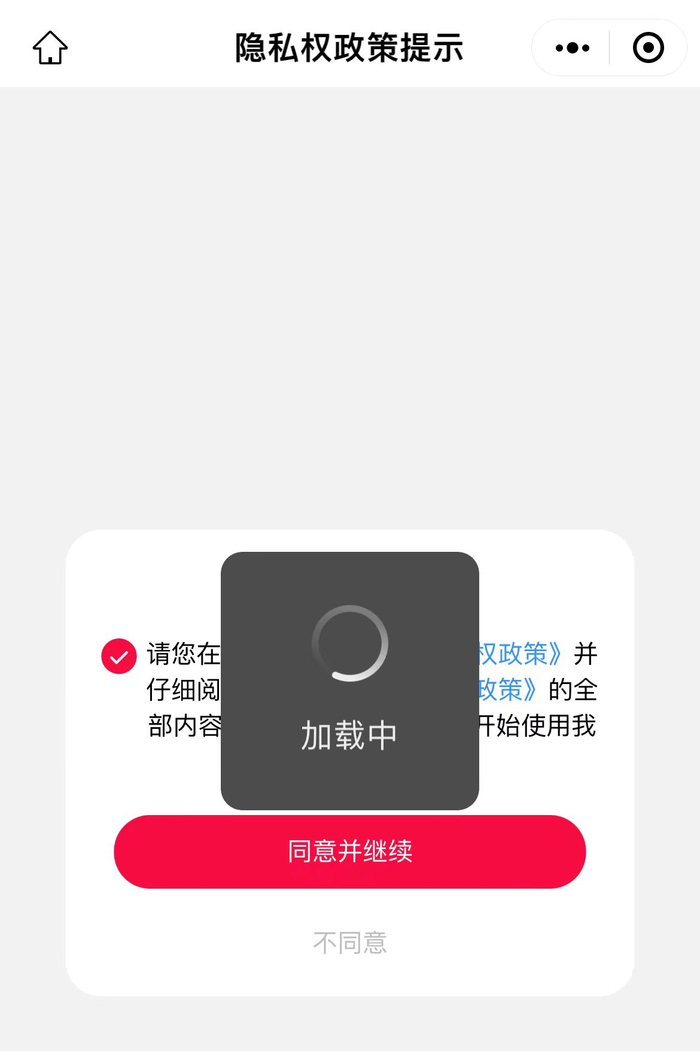 问题是,当记者点击《隐私权政策》想要阅读,页面却无法跳转,始终显示“加载中”的等待图标。考虑到或许是信号不好,记者特意扫码后又去店外点击,尝试多次依然无法跳转,看不到《隐私权政策》内文条款。但若直接点击“同意并继续”的选项,页面却能迅速跳转至点餐小程序。