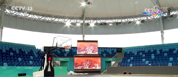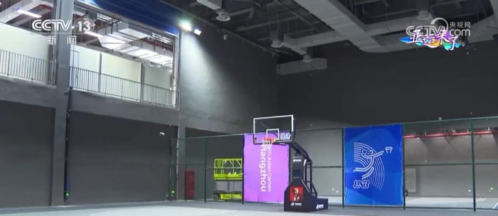总台央视记者 任梅梅:这里就是位于浙江德清的此次杭州亚运会三人制篮球项目的比赛场馆。整个场馆是钢结构的建筑,正式比赛场地位于整个建筑的屋顶。这里可容纳1009名观众现场观赛,在场地的中央吊顶处,还有4台非常清晰的显示屏,届时将实时播出赛场情况。三人制篮球比赛场地为15米×11米,不到常规篮球场的一半。