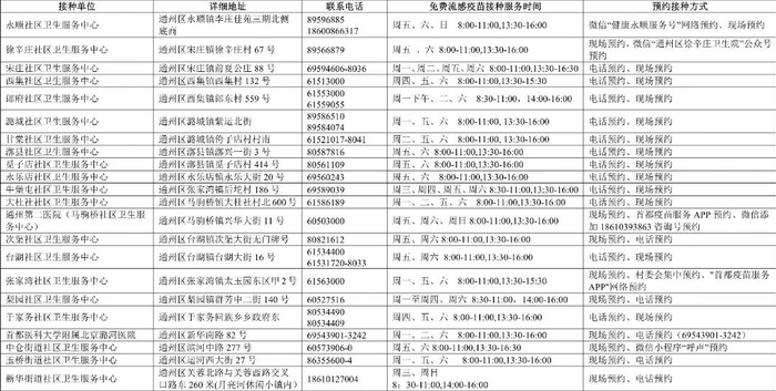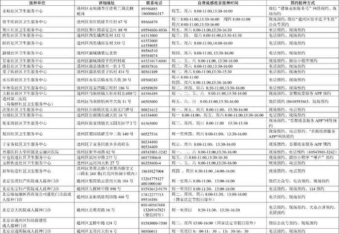通州区流感疫苗预防接种门诊具体地址、联系电话、预约接种方式如下: