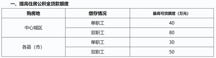 夫妻双方均缴存住房公积金的家庭,在中心城区(含浔阳区、濂溪区、经开区、八里湖新区、柴桑区)购房的,贷款额度由60万元/户提高至80万元/户,夫妻一方缴存住房公积金的家庭贷款额度由30万元/户提高至40万元/户。夫妻双方均缴存住房公积金的职工家庭,在县(市)购房的,贷款额度由35万元/户提高至50万元/户,夫妻一方缴存住房公积金的家庭贷款额度由25万元/户提高至30万元/户。