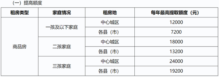 三孩家庭租房提取额度每月提高1000元,即:在中心城区(含浔阳区、濂溪区、经开区、八里湖新区、柴桑区)租房,每月提取2000元,全年提取24000元;在各县(市)租房,每月提取1600元,全年提取19200元。
