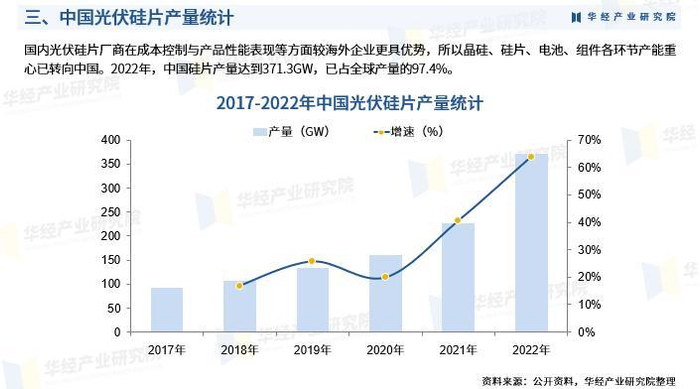 随着光伏相关技术的不断进步,光伏发电成本快速下降,全球光伏新增装机量连年上升,并且增长动力强劲。得益于整个光伏产业的快速发展,光伏硅片的发展也较为迅猛,2022年全球光伏硅片的产量为381.1GW,增速超60%。国内光伏硅片厂商在成本控制与产品性能表现等方面较海外企业更具优势,所以晶硅、硅片、电池、组件各环节产能重心已转向中国。2022年,中国硅片产量达到371.3GW,已占全球产量的97.4%。