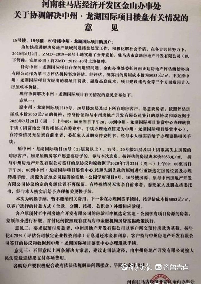 2020年7月,驻马店经济开发区金山办事处给原来的部分购房者提出了三个协调解决意见;一是还愿意要房的购房者,按照评估房屋成本价每平方米5053元的价格,办理转换手续后补缴费用;二是可以退预付款,并按照年化4.75%退还利息;三是不同意以上两个方案的建议走司法途径。