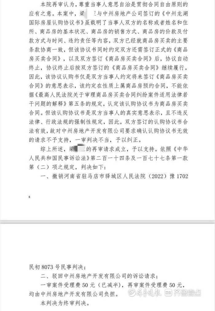 一审驻马店市驿城区人民法院审理后,判决中州公司胜诉。梁女士等人不服提出上诉,驻马店市中级人员法院二审后维持了原判。梁女士等人仍不服,向河南省高级人民法院提出了再审的请求。后驻马店市中级人民法院重新审理,并在今年6月做出了合同有效,一审判决不当予以纠正的判决。