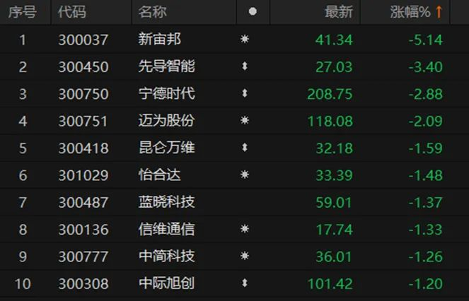 从指数成分股看,宁德时代、先导智能、新宙邦等新能源龙头品种早盘深度回撤,严重拖累创业板指数。截至发稿,宁德时代盘中跌幅接近3%,先导智能最大跌幅达到4%,新宙邦跌超5%。