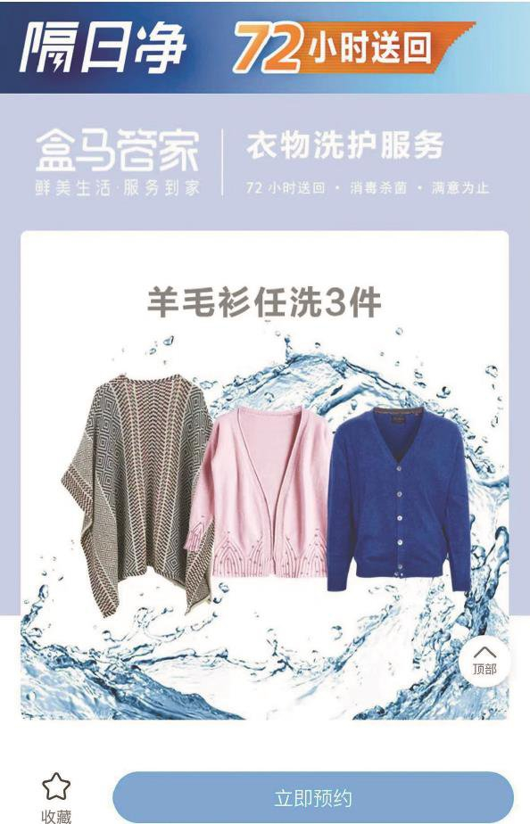 市民徐女士告诉记者,近期天气转凉,她准备把衣橱储藏的毛衣拿出来清洗,于是在盒马上选择了专业洗衣服务。“羊毛衫任选3件99元,上门取衣,隔天送回。”徐女士说,因为自己平时工作比较忙,网上下单可以预约时间上门取衣,洗完后隔天就可以送回来,非常方便,而且价格也不贵,自己就下单了。