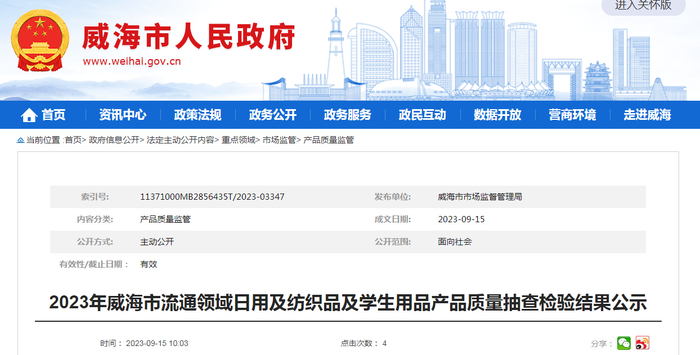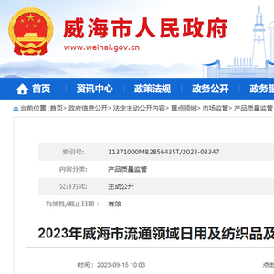 2023年山东省威海市流通领域日用及纺织品及学生用品产品质量抽查检验结果公示
