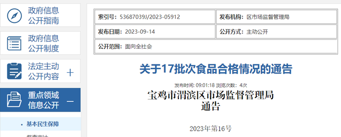 陕西省宝鸡市渭滨区市场监督管理局抽检食品17批次 全部合格