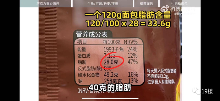 也就是说,如果你早餐吃了一个巧克力酱夹心面包(约120g-150g),那这一天的脂肪摄入量就要好好控制了,因为你可能在早餐就吃进去了接近40g的脂肪