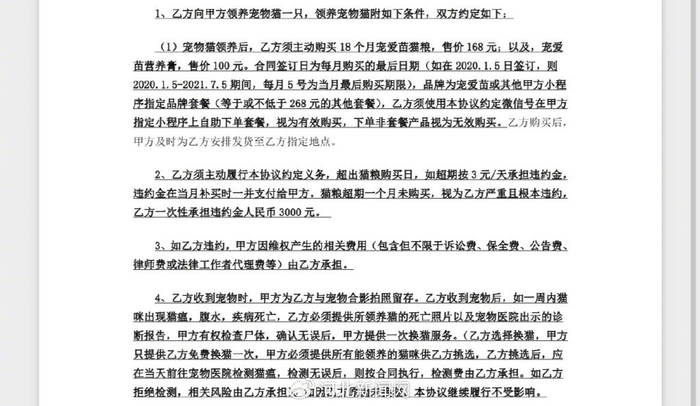 根据杨丹提供的领养合同,如果停止购买猫粮,需支付违约金3000元,“但重庆妙趣多一般会收1200-1300左右。即使少收,对于领养人而言,也是没有必要的开支,何况之前为猫咪治病,有人都花了近万元。”