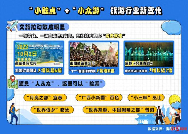 从需求侧看,随着人们生活方式和消费观念的多元化,常规打卡拍照游之外,激发游客出游的触点越来越小,一支视频、一顿美食、一场音乐节、一场赛事,都可能促成“说走就走”的旅行。在此背景下,十一期间,演唱会、音乐节、马拉松等举办,成为拉动旅游增长的显著动力。10月2日,嘉峪关市将举办2023长城马拉松暨“长城联赛”首发站活动,预计5000人参赛,由此拉动嘉峪关旅游订单同比去年同期增长超6倍。其中,十一期间,嘉峪关机票订单预订量同比增长近3倍,酒店订单同比增长7倍。9月29日起,南阳将举办3天4夜的迷笛音乐节,由此带动南阳“十一”整体订单预订量同比暴增11倍,较2019年同期也有两位数以上的增长。其中,酒店订单达到去年同期153倍。10月2日至7日,现象级文化IP舞蹈诗剧《只此青绿》将在成都城市音乐厅连演八场,由此带动附近酒店订单同比增长近7倍。