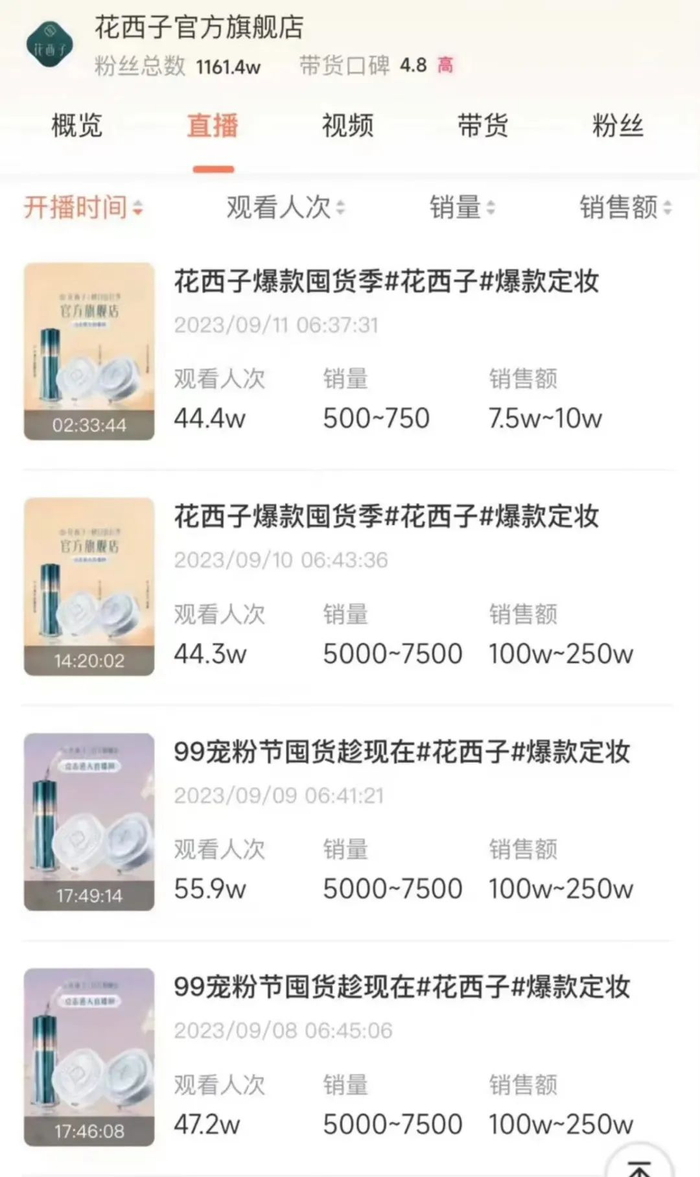 9月10日前花西子官旗每场直播销量在5000-7000,销售额在100万到250万元间。9月11日直播数据出现暴跌,销量降至原来的1成(500-750),对应销量额只有7.5万到10元万间。