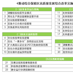 完善政策:研究制定《综合保税区管理条例》和综合保税区中长期发展规划,修订完善综合保税区准入、规划调整、退出、发展绩效评估等配套制度。在具体业务执行层面,提出制订出台《综合保税区检验检疫管理公告》以优化综合保税区检验检疫作业模式和作业流程。