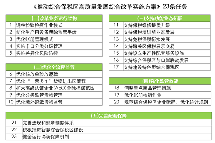 2023年7月31日,海关总署印发《推动综合保税区高质量发展综合改革实施方案》(以下简称《实施方案》),提出共23条具体改革任务,包含改革业务运行架构、优化全流程监管、支持功能业态拓展、强化监管效能、完善配套保障等五大方面。这些举措将为综合保税区注入强劲的发展新动能。