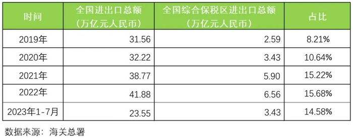 截至2023年8月底,我国海关特殊监管区域共171个,其中综合保税区161个。根据海关总署公布的统计数据,2019年至2022年,综合保税区对全国进出口额的贡献率逐年提高,2022年占比最高达到15.68%。