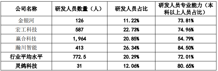 灵鸽科技认为公司业务规模、资金水平是影响研发人员人数过低的主要因素。兴许是受到人数过低的影响,灵鸽科技研发人员本科及以上研发人员占比均高于同行业可比公司,2022年灵鸽科技研发人员本科及以上研发人员占比为80.65%,而行业平均水平为72.01%。