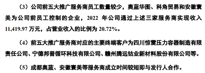 2023年8月30日公布的《发行人及保荐机构关于审核中心意见落实函的回复》“1.关于收入增长可持续性与推广服务商模式”显示:公司前五大推广服务商员工数量较少,奥蓝华图、科角贸易和安徽寰美为公司前员工控制的企业,2022年公司通过上述三家服务商实现收入11419.97万元,占营业收入的比例为20.72%。前五大推广服务商对应的主要终端客户为四川惊雷压力容器制造有限责任公司、宁德邦普循环科技有限公司、赣州腾远钴业新材料股份有限公司等。成都奥蓝、安徽寰美等服务商成立时间较短即与发行人合作。