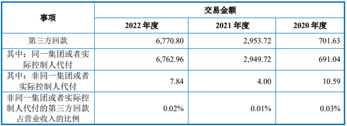 报告期内,第三方回款金额分别为701.63万元、2,953.72万元、6,770.80万元,其中各期非同一集团或者实际控制人代付的第三回款分别为10.59万元、4.00万元和7.84万元,发生额较小,占当期营业收入的比例分别为0.03%、0.01%和0.02%,主要系个别客户出现资金紧张的情况,通过第三方支付货款。
