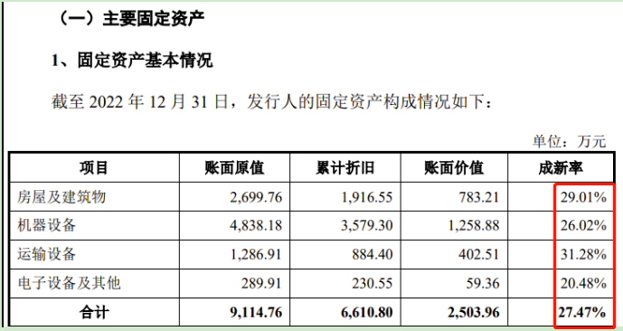 2022年末,公司固定资产成新率只有27.47%,除开房屋及建筑物,机器设备成新率只有26.02%、运输设备成新率只有31.28%、电子设备及其他成新率只有20.48%。机器设备等成新率如此之低,说明公司近几年没有购买什么新的机器设备。